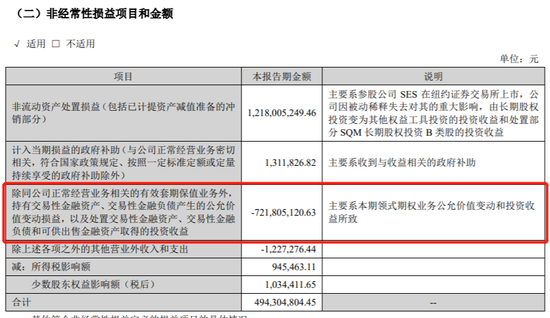 根据公司一季度报告显现,公司存在一笔非经常性损益递减项,金额高达7.22亿,回看公司近期调高半年报业绩预期,比从SQM获得的6.2亿净利润还高出“一个小目标”。