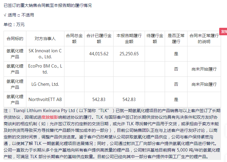 早在2019年8月,天齐锂业子公司TLK与LG化学签订了长期供货协议,约定单一年度氢氧化锂产品基础销售数量不低于TLK澳洲奎纳纳地区氢氧化锂建设项目达产后年产能的15%。