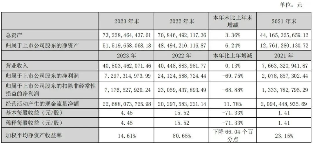 天齐锂业2023年净利为73亿元,较上年同期的241.25亿元下降69.75%;扣非后净利为71.77亿元,较上年同期的230.59亿元下降68.88%。