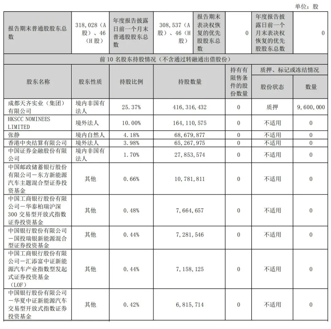 截至2023年6月30日,成都天齐实业(集团)有限公司持股25.28%,HKSCCNOMINEESLIMITED持股10%,张静持股为4.18%,香港中央结算有限公司持股为3.93%,中国证券金融股份有限公司持股为1.7%,中国邮政储蓄银行股份有限公司-东方新能源汽车主题混合型证券投资基金持股为0.54%;