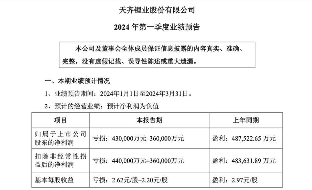 4月23日晚间,天齐锂业披露2024年第一季度业绩预告,预计今年第一季度净亏损36亿元—43亿元,而去年同期净利润48.75亿元,同比下降超过173.85%。