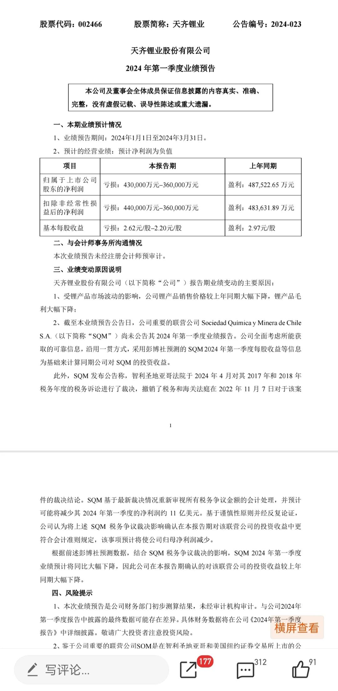公开资料显示,SQM是一家全球重要的钾、锂产品生产企业,在智利圣地亚哥和美国纽约证券交易所上市,天齐锂业持有其22.16%的股权。目前,SQM尚未公告其第一季度业绩报告。天齐锂业是结合机构预测数据和SQM的裁决情况,对业绩做出的预估。