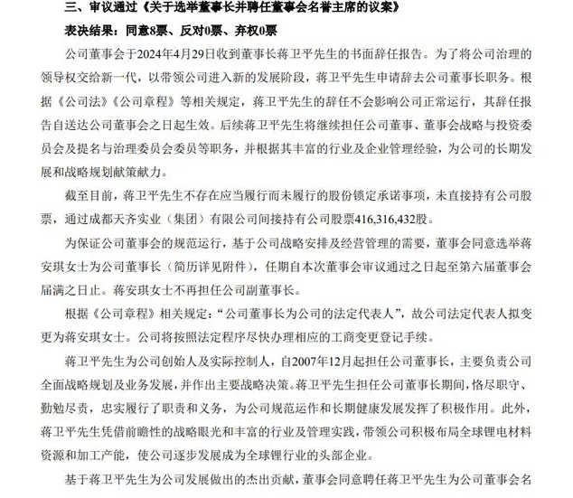 天齐锂业公告称,4月29日天齐锂业董事会审议通过了《关于选举董事长并聘任董事会名誉主席的议案》。公告表示,公司董事会于4月29日收到董事长蒋卫平的书面辞任报告。为了将公司治理的领导权交给新一代,以带领公司进入新的发展阶段,蒋卫平申请辞去公司董事长职务。后续蒋卫平将继续担任公司董事、董事会战略与投资委员会及提名与治理委员会委员等职务。同时,为保证公司董事会的规范运行,基于公司战略安排及经营管理的需要,董事会同意选举蒋安琪为公司董事长。在此之前,蒋安琪已担任了两年的集团总经理。