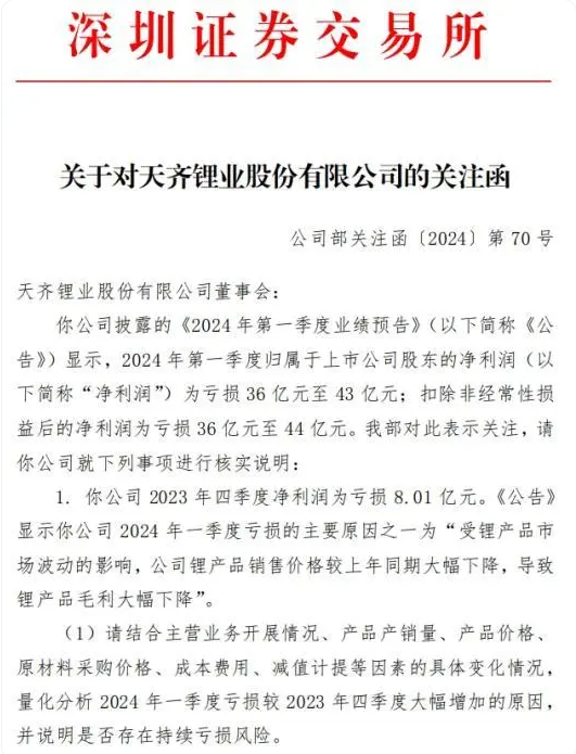 从公司业绩看,蒋安琪出任总经理的2021年,天齐锂业营收达到76.63亿元,净利润扭亏为盈,达20.79亿元;2022年,天齐锂业实现双重上市,同时受新能源及新能源汽车行业爆发、碳酸锂等材料价格飙升影响,营收也火箭式上涨至404.5亿元,净利润达到241.25亿元;2023年,其营收持平,为405亿元,净利润却下滑至72.97亿元。虽然蒋安琪现已成功上位,但当前却面临锂业动荡,刚刚过去的2024年一季度,天齐锂业一季度归属于上市公司股东的净亏损约38.97亿元,去年同期净利则为约48.75亿元。业绩预告披露当天,天齐锂业即出现“一字跌停”,并收到深交所关注函。