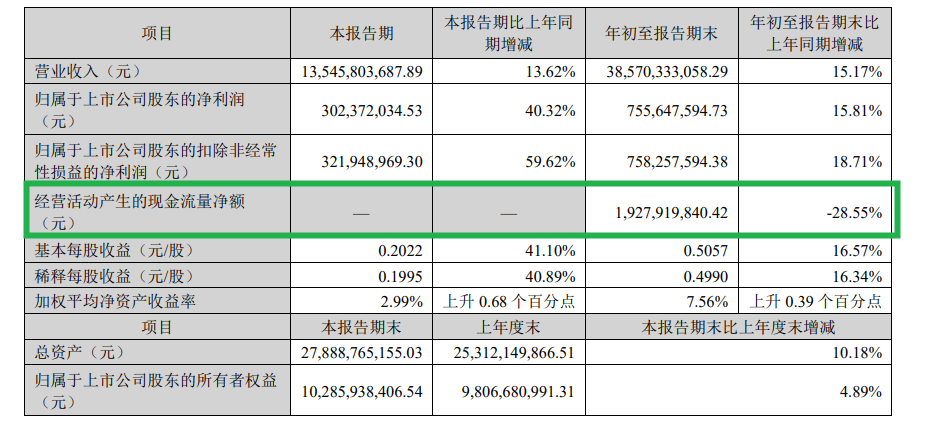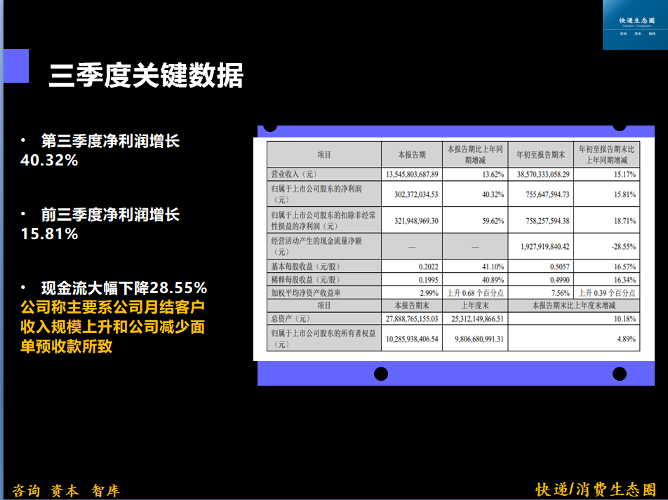 10月27日,快递业首份3季报出炉,申通快递(002468.SZ)发布三季报。第三季度营收为135.46亿元,同比增长13.62%;净利润为3.02亿元,同比增长40.32%。前三季度营收为385.7亿元,同比增长15.17%;净利润7.56亿元,同比增长15.81%。经营现金流19.28亿元,下降28.55%;负债率达63.1%,再创历史新高。根据相关数据显示,三季度,QFII减持1214万股,社保新进1476万股。从三季报的结果看,申通快递的负债重压下,利润增速与业务放缓的博弈。