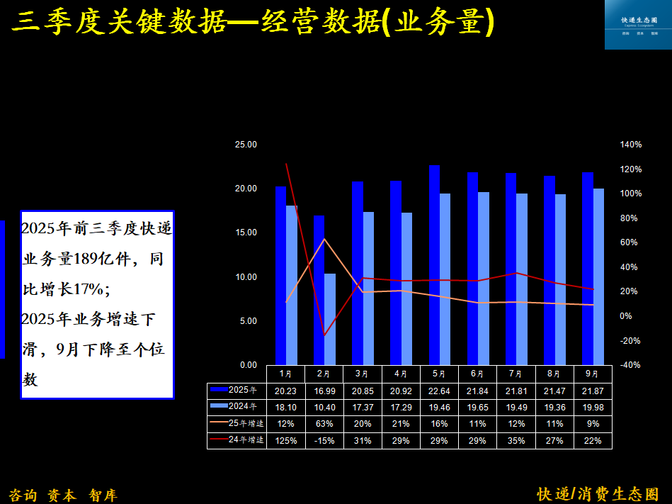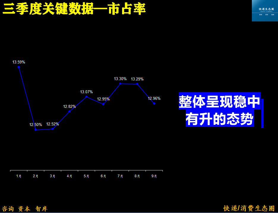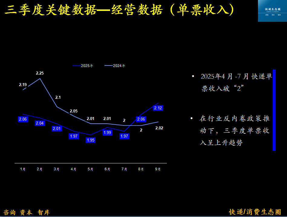 前三季度,全国快递业务收入和快递业务量分别完成1.1万亿元和1450.8亿件,同比分别增长8.9%和17.2%。三季度,快递平均价格企稳回升,三季度快递平均价格较二季度增长0.5%。7-9月,快递整体平均价格分别为7.35元/件、7.36元/件和7.55元/件。