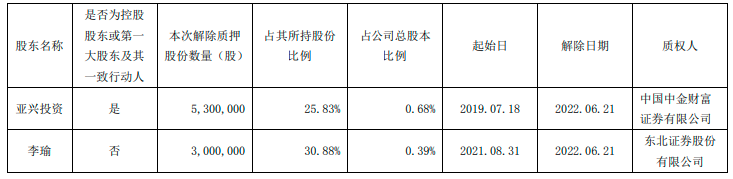 6月23日,双环传动(SZ002472)公告,股东玉环市亚兴投资有限公司解除质押公司股份530万股,占其所持股份比例25.83%,占公司总股本比例0.68%;股东李瑜解除质押公司股份300万股,占其所持股份比例30.88%,占公司总股本比例0.39%。