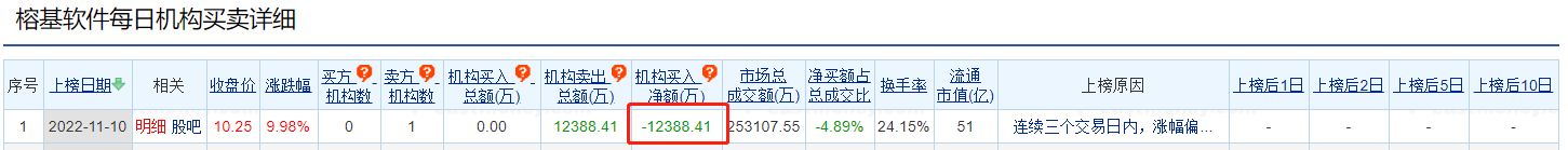 龙虎榜数据显示,作为连续三个交易日内涨幅偏离值累计达到20%的证券,卖出榕基软件金额最大的前五名中,有1家机构专用席位。经统计,榕基软件的机构席位三个交易日净卖出金额为12388.41万元。