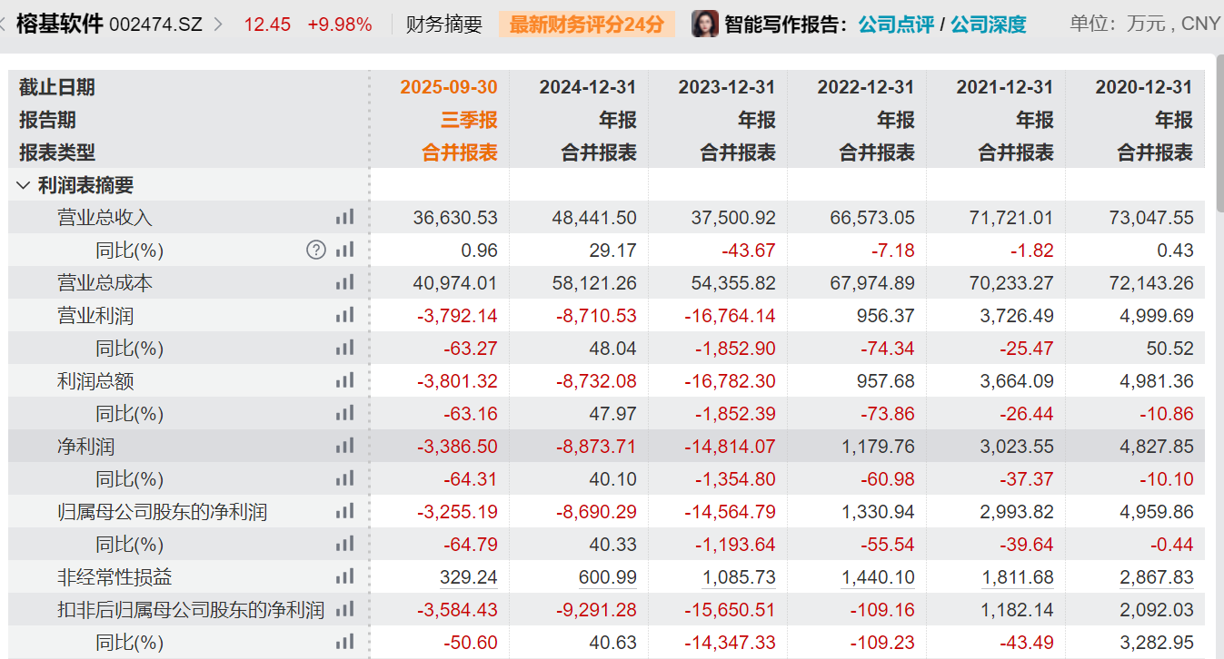 对此, 榕基软件 并未在2025年三季报中解释亏损原因,但在2025年半年度业绩预告里称,公司业绩主要受外部经营环境持续严峻,项目实施进度延后及回款滞后,以及较高的人力成本与资产摊销折旧压力等因素影响。