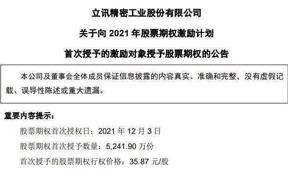 2021年12月4日,立讯精密(002475)发布《关于向2021年股票期权激励计划首次授予的激励对象授予股票期权的公告》。