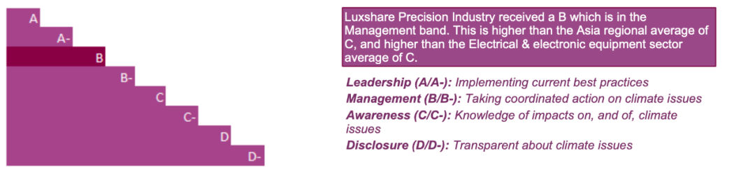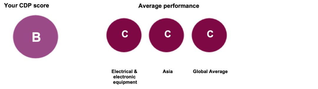 CDP是一家总部位于伦敦的国际组织,致力于推动企业和政府减少温室气体排放,保护水和森林资源。CDP收集全球重要企业的环境信息,并做出从A到D-八个等级的评估,是企业环境信息透明度的重要标准,B级意味着企业已经评估了广泛的环境问题,采取行动来解决评估后的环境问题,并提供良好环境管理的行动证据。CDP与全球超过680家、总资产达130万亿美元的机构投资者以及超过280家采购企业合作,通过投资者和买家的力量以激励企业披露和管理其环境影响。本年度全球共有超过18000余家企业回应CDP评鉴。