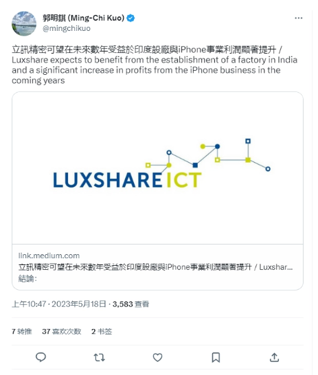 5月18日消息,苹果有望与立讯精密在印度共同设立生产线,以支持其在印度市场和供应链的增长。这一消息来自知名苹果分析师郭明錤的预测。