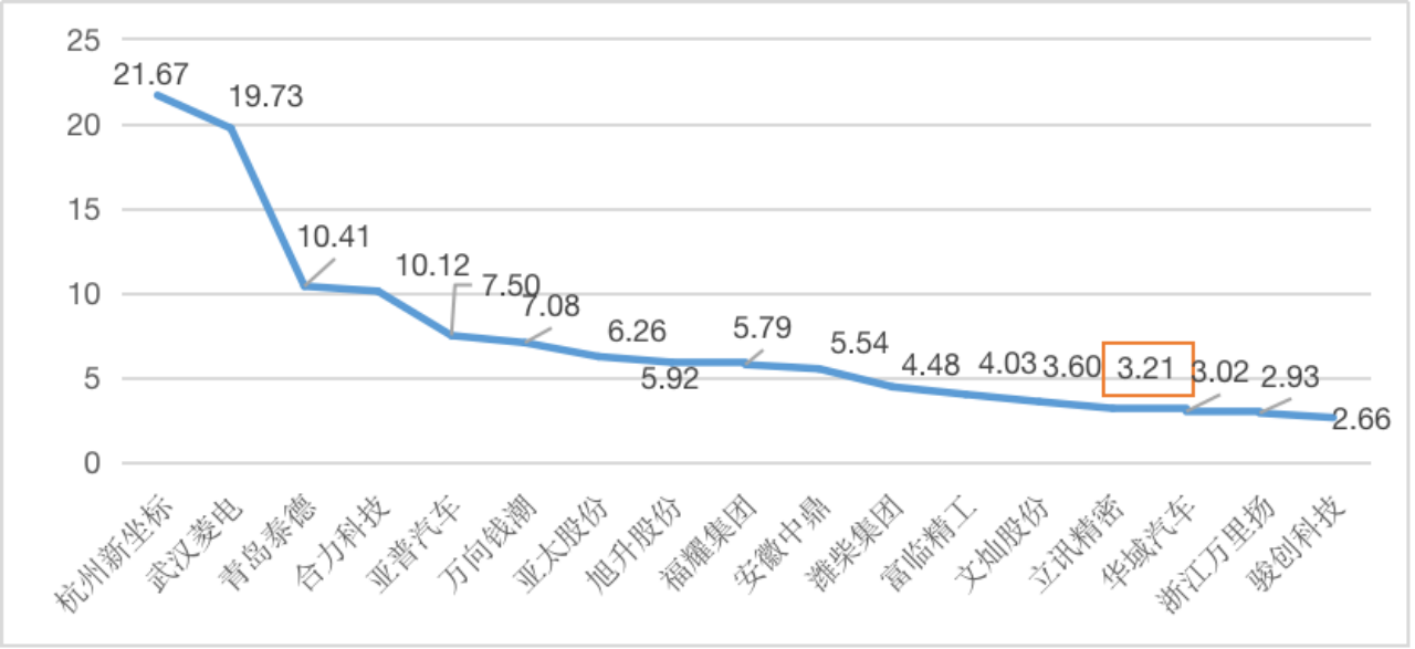 2021年“汽车零部件”赛道企业研发强度和发明专利数情况如表1所示,除武汉菱电(12.12%)、杭州新坐标(7.43%)、浙江万里扬(6.88%)、瑞鹄模具(5.82%)四家企业的研发强度较高,其他企业的研发强度均不足5%。2021年立讯的研发强度为4.31%,研发人员拥有的专利数为951件,累计有效专利3090件,处于行业前列。据2022年年报,截止2022年末,立讯精密累计拥有发明专利4526件,较2021年末增长46.47%。可见,立讯精密的研发成果显著,研发能力处于稳步提升中。