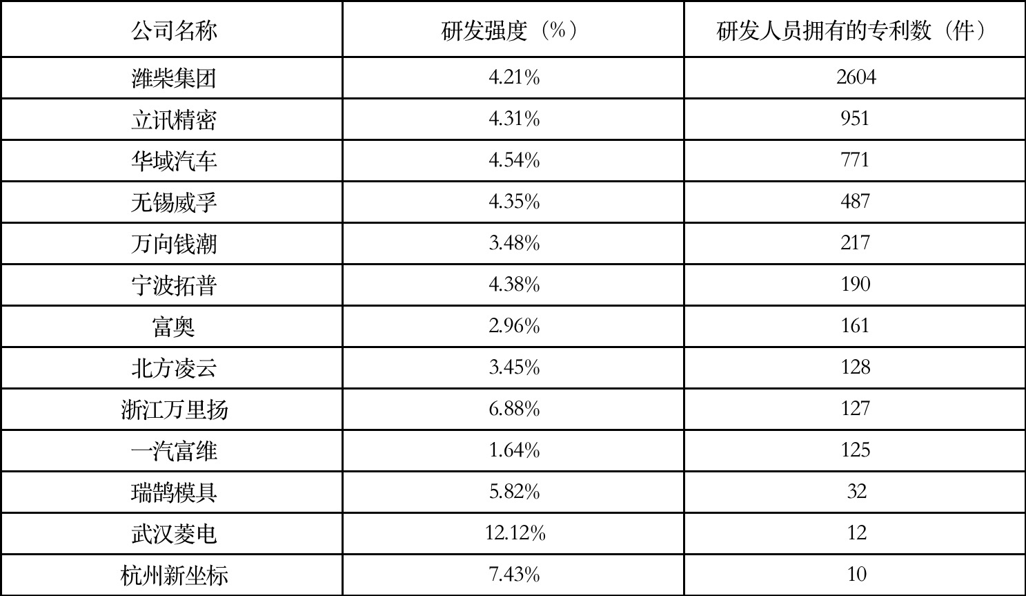 表1 “汽车零部件”赛道企业研发强度和发明专利数(节选)