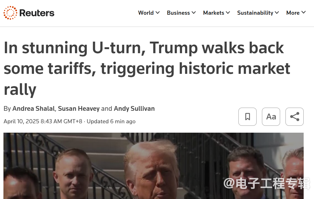 特朗普在周三(9日)戏剧性地逆转了对全球征收高额关税的做法,在对近60个国家的高额关税仅生效数小时后,他便表示将暂停这些关税90天。