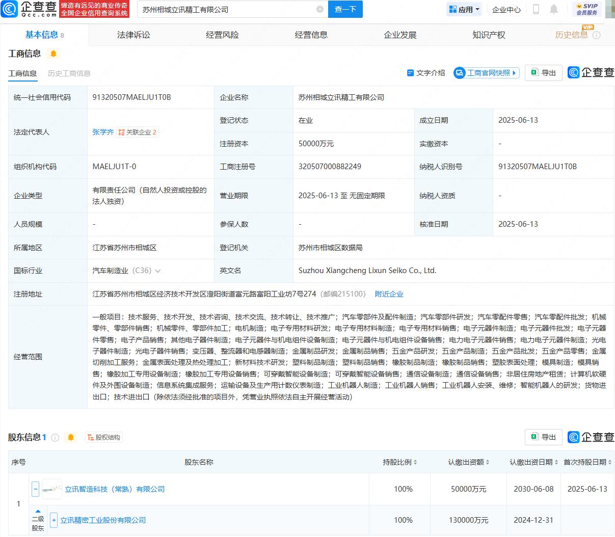 近日,苏州相城立讯精工有限公司成立,法定代表人为张学齐,注册资本为5亿元,经营范围包含:汽车零部件及配件制造;汽车零部件研发;汽车零配件零售;汽车零配件批发;电子专用材料制造;电子元器件制造;光电子器件制造;智能机器人的研发等。股权穿透显示,该公司由立讯精密间接全资持股。