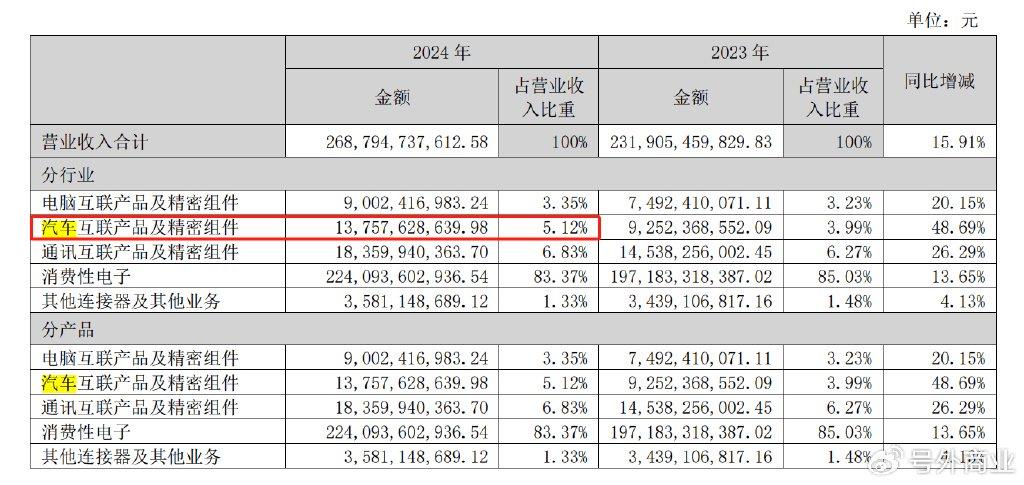 利润空间挤压。2023年苹果要求代工厂降价15%,立讯精密毛利率应声跌破10%。相比之下,汽车电子业务毛利率达21.3%,却仅占总营收5.12%。