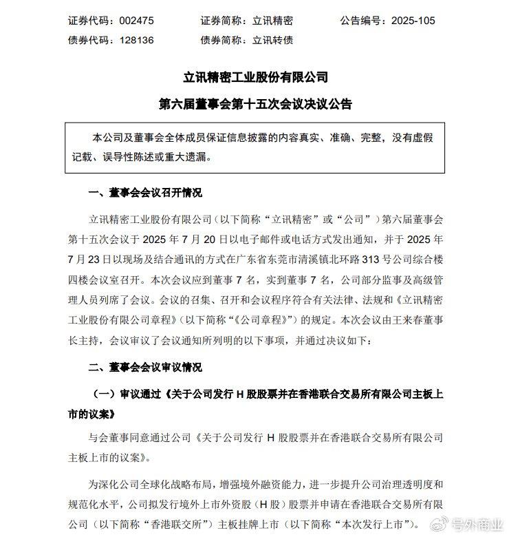 7月23日晚,这家市值2753亿元的“果链龙头”立讯精密连发36份公告,正式启动“A+H”双资本平台战略。公告显示,公司计划发行不超过总股本5%的H股,募资逾10亿美元投向全球产能扩张和技术研发。
