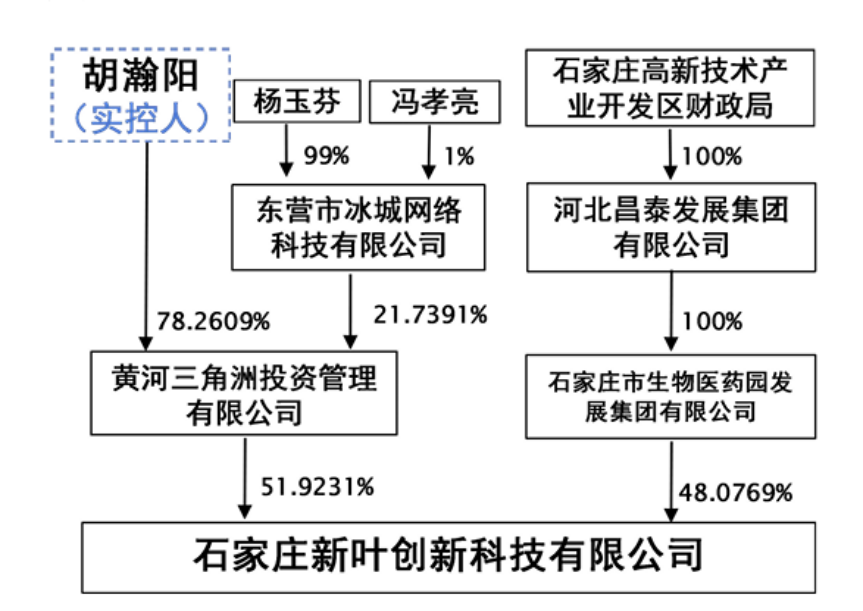 作为专为本次收购成立的主体,受让方新叶创新成立于2025年12月9日,注册资本5.2亿元。股权结构方面,黄河三角洲投资管理有限公司持股51.92%,实际控制人为胡瀚阳;石家庄市生物医药园发展集团有限公司持股48.08%,系石家庄高新区财政局全资孙公司。