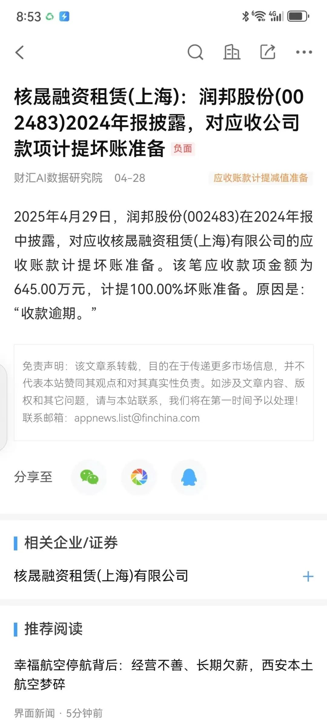 2025年4月29日,润邦股份(002483)在2024年报中披露,对应收核晟融资租赁(上海)有限公司的应收账款计提坏账准备。该笔应收款项金额为645.00万元,计提100.00%坏账准备。原因是:“收款逾期。”