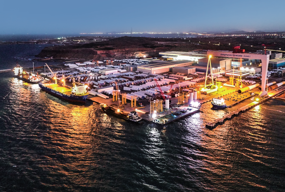 在这些基地中,蓬莱基地以海域宽阔、自然水深10-16米的优良条件,被大金打造成拥有5个深水泊位,年吞吐量300万吨的风电母港。这座中国的“埃斯比约港”是大金将风电塔筒/桩基产品运往全球,是支撑海上风电发展的突破口。