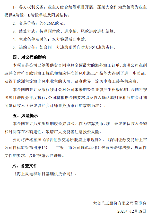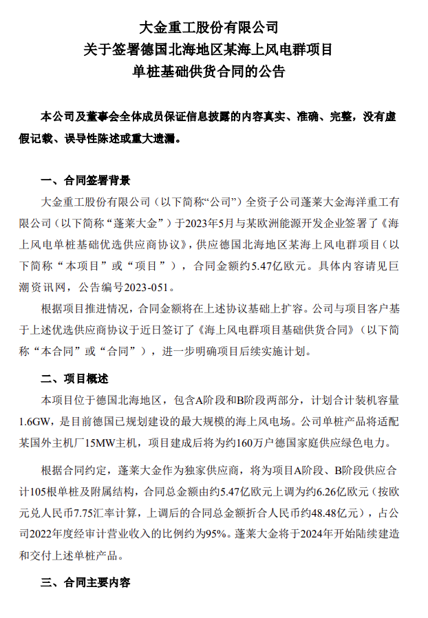 12月18日,大金重工发布《关于签署德国北海海上风电群项目单桩基础供货合同的公告》。