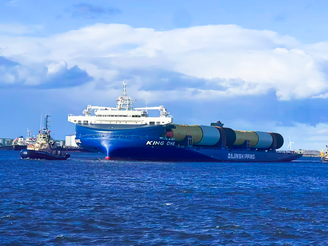 2026 年 4 月 6 日,英国蒂斯港(Tees Port)——大金重工股份有限公司(以下简称“大金重工”)首制 4 万吨甲板运输船 KING ONE 轮跨越近 9000 海里,从中国蓬莱港顺利抵达英国蒂斯港,圆满完成首航征程。本次运输搭载 8 根直径 10 米、单重超 1200 吨的超大型海上风电单桩,KING ONE 轮的顺利抵港,充分验证了大金重工自主造船的过硬实力与运输服务的专业水平。