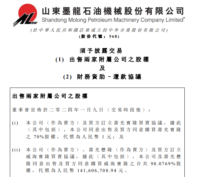 近日,山东墨龙石油机械股份有限公司(以下简称“山东墨龙”)发布公告,为优化资产负债结构,实现低效资产剥离,公司拟将直接持有的子公司寿光宝隆石油器材有限公司(下称“寿光宝隆”)70%股权、直接及通过全资子公司寿光懋隆新材料技术开发有限公司间接持有的威海市宝隆石油专材有限公司(下称“威海宝隆”)合计98.0769%股权以1.42亿元价格转让给芜湖智赢项目投资合伙企业(有限合伙),预计将对2024年产生收益约2.7亿元。