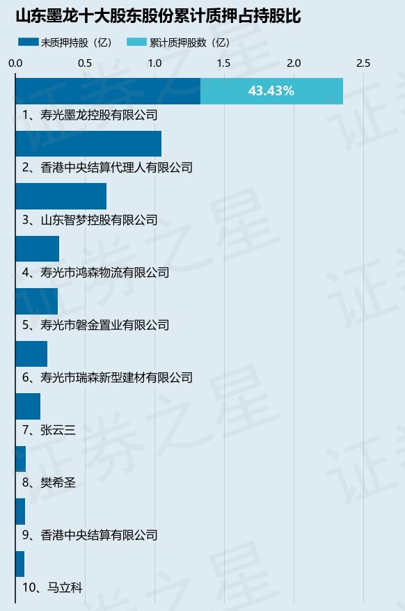 截止本公告日,股东寿光墨龙控股有限公司已累计质押股份1.02亿股,占其持股总数的43.43%。本次质押后山东墨龙十大股东的累计质押股份占持股比例见下图:
