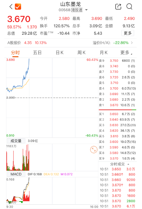 截至6月13日10时52分,港股山东墨龙盘中涨近60%,成交额超9亿港元。