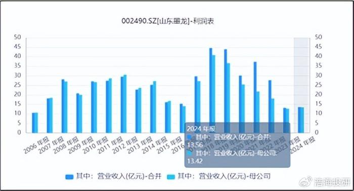 以上多重因素的影响下,自2019年开始,山东墨龙的营业收入持续下滑。2024年,公司总收入规模约为14亿元,较2018年缩水30亿元。这条卧在山东的墨龙,似乎逐渐在沉没。
