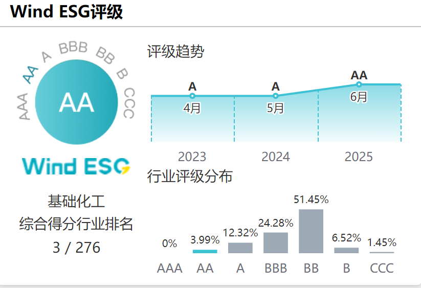 6月18日,荣盛石化(002493.SZ)凭借其在绿色转型与可持续发展引领方面的卓越表现,Wind ESG评级由A上调至AA,此评级为目前行业最高评级。