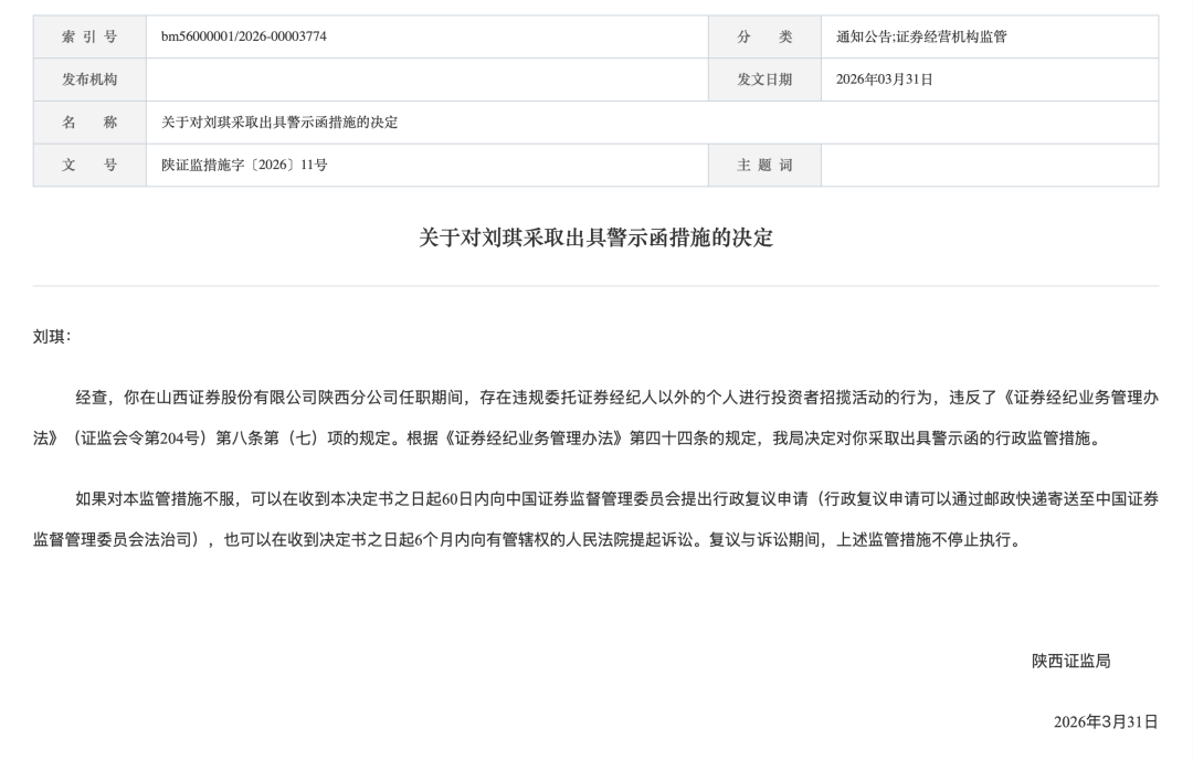 4月9日消息,近日,陕西证监局发布一则监管决定,山西证券股份有限公司陕西分公司员工刘琪因违规行为被采取出具警示函的行政监管措施。