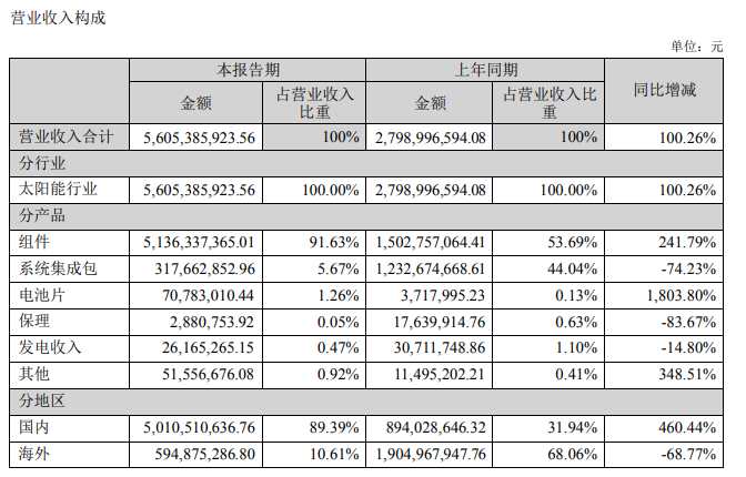 据了解,协鑫集成聚焦于低碳光储一体化智能解决方案,其中光伏组件业务收入得到了较快的发展。今年上半年,公司营业收入56.05亿元,组件收入为51.36亿元,同比增长241.79%,占营收比重从去年同期的53.69%提升至91.63%。