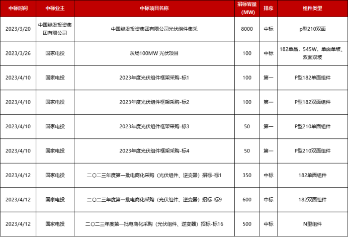 除此之外,协鑫集成还在国家电投2023年度光伏组件框架采购4个标段、新华水电2023年度光伏组件集中采购、华电集团2023年光伏组件集中打捆采购等多个标段中,位列第一候选人。