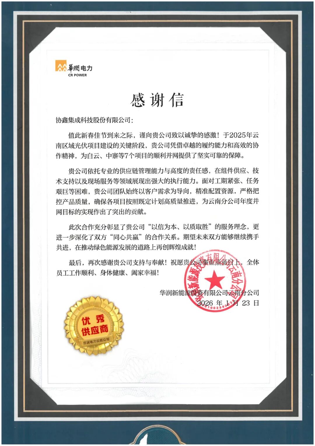 新春来临之际,协鑫集成收到华润新能源投资有限公司云南分公司发来的感谢信,华润新能源对协鑫集成在2025年云南区域光伏项目建设中的突出贡献给予高度评价,并表达了对未来深化合作的殷切期望。这一认可不仅彰显了协鑫集成在新能源领域的专业实力,更印证了双方“同心共赢”的合作关系。