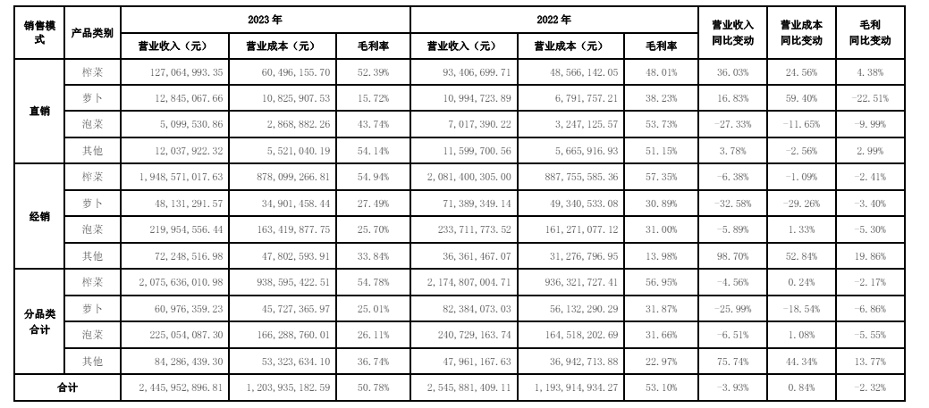 从数据上看,榨菜产品毋庸置疑是涪陵榨菜的主要营收来源,2023年涪陵榨菜旗下榨菜品类实现营收20.76亿元,占涪陵榨菜总营收比例超过84%,不过2023年榨菜品类销量、毛利率都出现了下滑,涪陵榨菜2023年榨菜销量为11.33万吨,同比缩减3.82%;营业收入同比下滑4.56%;毛利率为54.78%,同比减少2.17%。