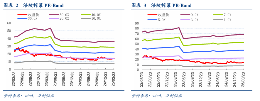 成本红利释放,但受24Q4报表集中拖累,导致24全年盈利同比基本持平。24年公司毛利率录得51.0%,同比+0.3pcts,尽管存在低价青菜头成本红利,但由于Q4集中拖累,导致整体毛利率改善不及预期,而销售费用率/管理费用率同比+0.2pcts/+0.4pcts。最终公司全年净利率为33.5%,同比-0.3pcts。单24Q4毛利率为43.4%,同比-7.3pcts,而销售费用率同比-0.9cpts,毛销差同比-6.4pcts原因一是规模效应损失,二是预计下半年搭赠费用集中在24Q4以折让方式进行处理,最终单Q4实现归母净利率30.3%,同比-3.3pcts。