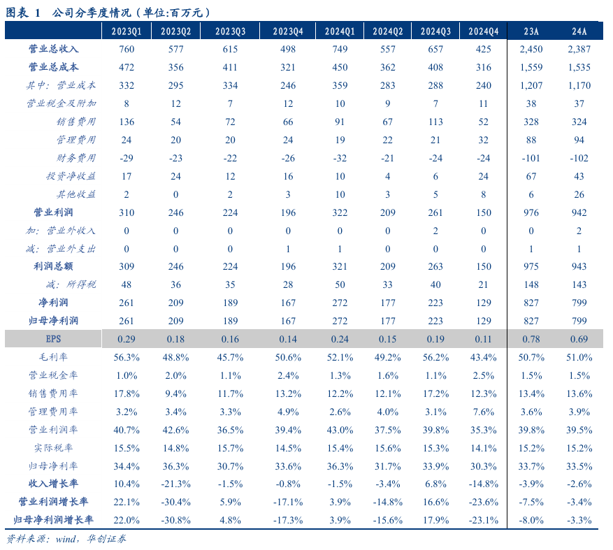 公司发布2024年年报。24年实现营业总收入23.87亿元,同比-2.6%;归母净利润7.99亿元,同比-3.3%。单Q4实现营业收入4.25亿元,同比-14.8%;归母净利润1.29亿元,同比-23.1%。