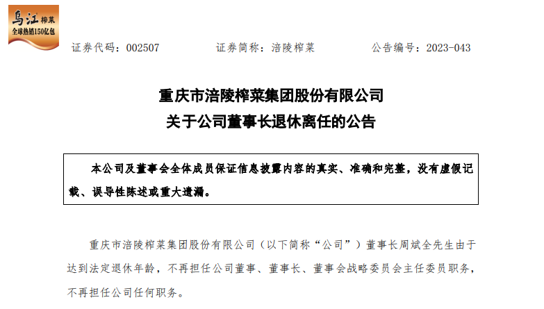 2023年底,涪陵榨菜发布公告,时年60岁的旧掌门人周斌,全到龄退休,卸下了所有职务。