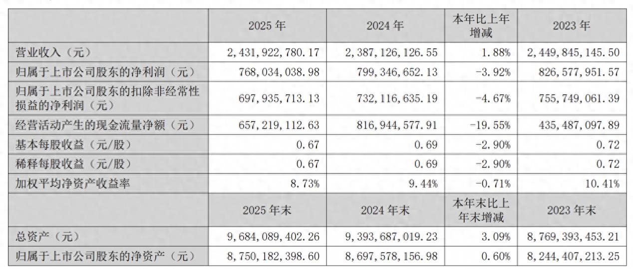 2025年,涪陵榨菜实现营业收入24.32亿元,同比增长1.88%;归属于上市公司股东的净利润7.68亿元,同比下降3.92%;归属于上市公司股东的扣除非经常性损益的净利润6.98亿元,同比下降4.67%。