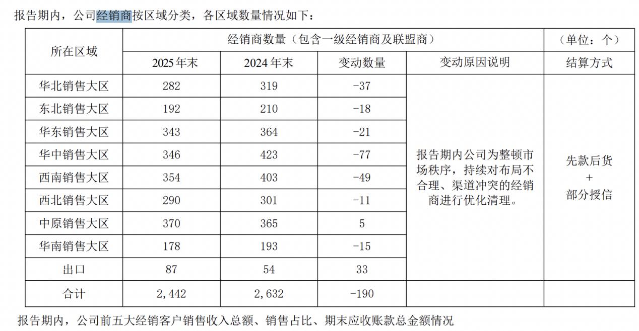 2025年末,涪陵榨菜经销商共有2442家,较2024年末2632家净减少190家。其中,华中销售大区减少77家,减少数量最多,而中原销售大区、出口分别增加5家、33家。