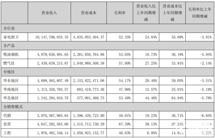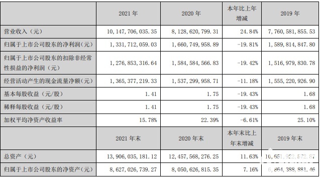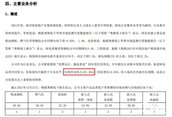 除去这一点失误的话,老板电器2021年全年营业收入101.48亿元,同比增长24.84%;归属上市公司股东的净利润13.32亿元,同比下滑19.81%;经营活动产生的现金流量净额13.65亿元,同比下滑11.18%。这也是老板电器首次年收入超过100亿元。