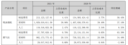 一个重要原因是成本大幅上涨。吸油烟机的原材料成本从14.07亿元增至19.29亿元,同比增加37.1%,制造费同比增加58.5%;燃气灶的原材料成本从7.3亿增加34.5%至9.82亿元,制造费增加63.4%。