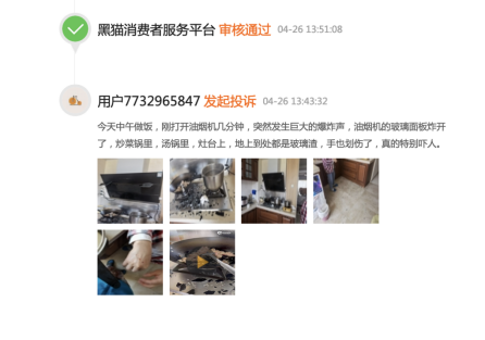 2022年4月26日,用户7732965847投诉称,老板油烟机发生爆炸:“今天中午做饭,刚打开油烟机几分钟,突然发生巨大爆炸声,油烟机玻璃面板炸开了。炒菜锅里,汤锅里,灶台上,地上到处都是玻璃渣,手也划伤了,真的特别吓人。”