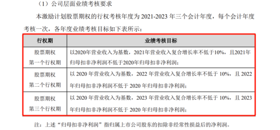 2021年,老板电器发布股权激励计划方案,确定此后三年的年度业绩考核目标:2021-2023年,各年营业收入复合增长率≥10%,且归母扣非净利润不得低于2020年。