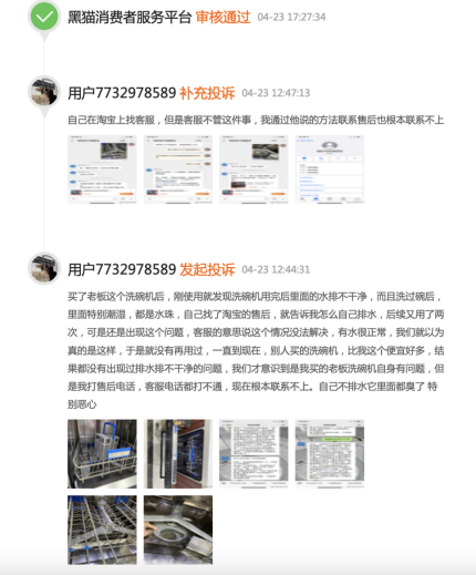 2022年4月23日,用户7732978589 投诉称:“买了老板这个洗碗机后,刚使用就发现洗碗机用完后里面的水排不干净,而且洗过碗后,里面特别潮湿,都是水珠……我打售后电话,客服电话都打不通,现在根本联系不上。自己不排水它里面都臭了,特别恶心。”