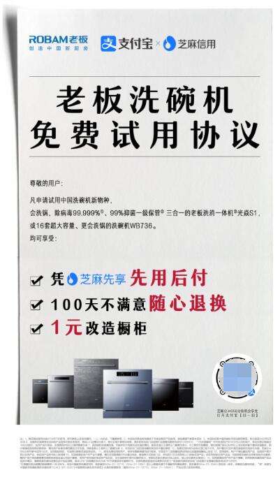 互联网时代,大到厨房电器,小到零件部品,万物皆可网购。然而,网购为人们提供了极大便利的同时,也存在一定的弊端。譬如商品图片“高端大气上档次”,实物却与图片相差十万八千里,这种落差降低了消费者的消费体验。尤其是针对洗碗机这一家电行业。“能不能洗干净”、“能不能洗锅”、“够节水省电吗”成为用户了用户心中挥之不去的疑虑。为了消除这种疑惑,国内厨电高端品牌老板电器联合支付宝开启100天免费试用活动,消费者可以通过“先用后付”的形式,收到商品后觉得满意再购买。解决了用户决策的最后顾虑,掀起了中国洗碗机普及风暴。