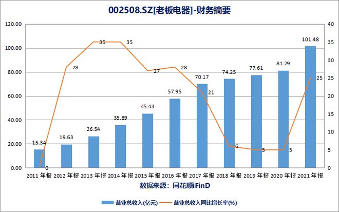 数据显示,2010年-2020年,老板电器营业收入由12.32亿元增长至81.29亿元,涨幅达560%;净利润则从1.34亿元增长至16.61亿元,涨幅达到1136%。