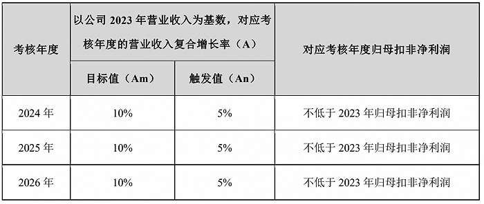 而管理层的激励考核标准,是以年度营收复合增长率5%为触发值,10%为目标值,且年度归母扣非净利润不低于2023年水平。